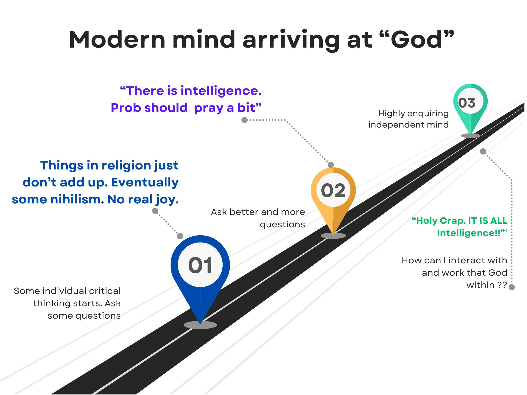 2. We/you/me are all part of this process and an expression of this intelligence. What's fascinating is that our cognitive development mirrors and interacts with the evolutionary development of the universe itself. This is different from traditional religious view, where an external “entity” is passing judgement on what is good and bad. No one seems to have a good explanation how come the bad actions of the “devil” (who is in fact also created by God, the almighty), are also not a creation of God? Did “God” just put on a massive theatre production? For what purpose - joy and experience? Or God (an entity somewhere out there) is not almighty and not fully in control?